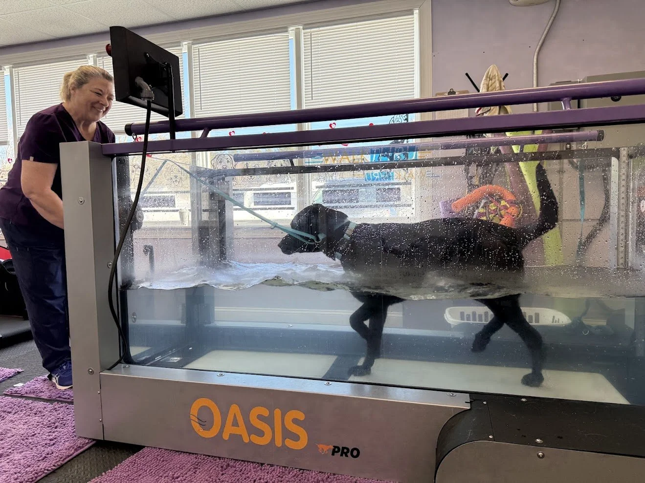 The underwater treadmill provides low-impact exercise that supports strength, mobility, and endurance while minimizing stress on the joints. Adjustable speed and water depth allow sessions to be tailored to each dog’s needs.